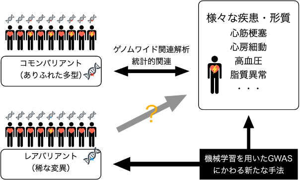 2000年代にはゲノムワイド関連解析(GWAS)が活発に行われ、ヒトゲノムの一塩基多型(SNP)などのコモンバリアントと疾患や形質の関連が統計的手法を使って網羅的に評価されてきました。しかしながら、例えば10000人に一人だけが持っている稀な変異(レアバリアント)は従来のGWASでは検出が困難です。