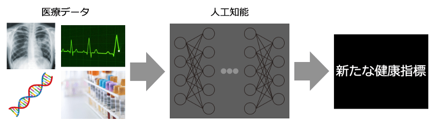 我々は人工知能を用いて、様々な検査データやゲノム情報から、疾患の有無、加齢の程度、将来疾患を発症するリスクなどを推定する新たな健康の指標の創出を目指しています。臨床使用に耐えうる新たなマーカーを作成できれば、健康診断での疾患の早期発見や早期治療介入などへの臨床応用が期待されます。