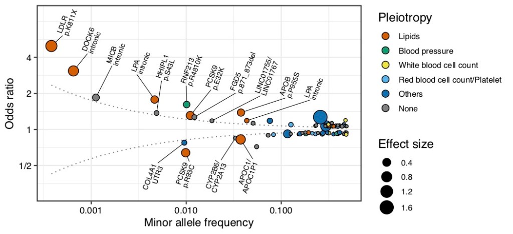Typically, the odds ratio of disease-associated genetic variants found in GWAS is mostly small, ranging from 1.1-1.2. This is due to the fact that previous GWASs have not been able to accurately estimate the pathogenicity of genetic variants with a population frequency of less than 1%. In the present study, we used a reference panel that is specific to the Japanese population, and thus were able to accurately estimate the pathogenicity of low to very low frequency variants (<1% population frequency). The strongest pathogenicity was observed in a genetic mutation on LDLR gene (stop-gain mutation [8], LDLR p.K811X, 0.038% population frequency) that substantially reduces the function of LDL receptors, which are important for cholesterol metabolism. This mutation had a strong effect on the risk of developing coronary artery disease (odds ratio [10]) of 5 (Figure 1). Carrying this mutation could be interpreted as being five times more likely to develop coronary artery disease than those who did not carry it. We also found that carrying this mutation increased serum total cholesterol levels by an average of 57 mg/dL.