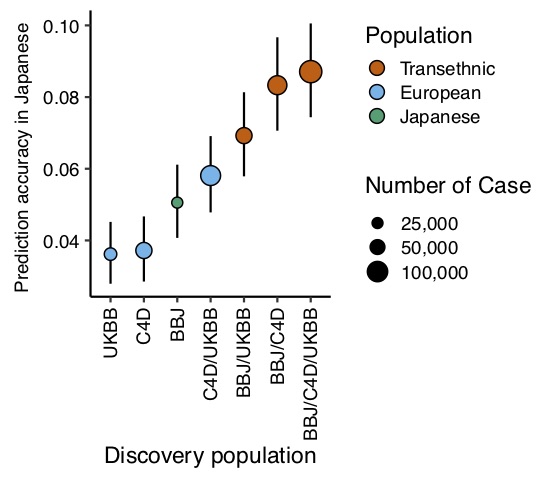 We then used the results of the GWAS obtained in this study to create a GRS and examine its predictive performance in the Japanese genomic cohort (JPHC study, J-MICC study and OACIS study). It has long been known that GRS calculated from GWAS results for a specific ancestry population do not fit other populations and have poor predictive performance. In this study, it was confirmed that the GRS calculated from the GWAS results for European populations had lower predictive performance than the GRS calculated from the GWAS results for Japanese. When the trans-ethnic GWAS results were used to create the GRS, the performance of the trans-ethnic GRS was found to be superior to the Japanese GRS and the European GRS (Figure 2).